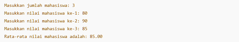 | #include <stdio.h>int main() { int jumlahMahasiswa, i; float total = 0, nilai, rataRata; printf(“Masukkan jumlah mahasiswa: “); scanf(“%d”, &jumlahMahasiswa); for (i = 1; i <= jumlahMahasiswa; i++) { printf(“Masukkan nilai mahasiswa ke-%d: “, i); scanf(“%f”, &nilai); total += nilai; } rataRata = total / jumlahMahasiswa; printf(“Rata-rata nilai mahasiswa adalah: %.2f\n”, rataRata); return 0;} |