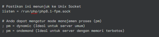 Untuk optimasi performa, Anda dapat menyesuaikan konfigurasi pool utama, yang biasanya terletak di /etc/php/8.1/fpm/pool.d/www.conf. Pastikan pengaturan berikut sudah dikonfigurasi untuk menggunakan Unix Socket (paling optimal untuk localhost):