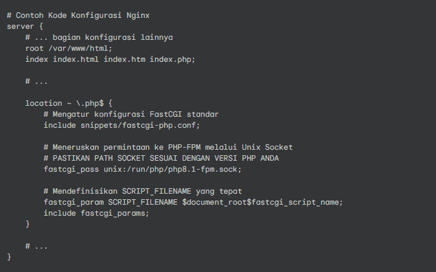 Langkah terpenting adalah memberi tahu Nginx cara meneruskan permintaan .php ke PHP-FPM. Buka file konfigurasi virtual host Anda (misalnya /etc/nginx/sites-available/default) dan tambahkan atau edit blok location ~ \.php$:
