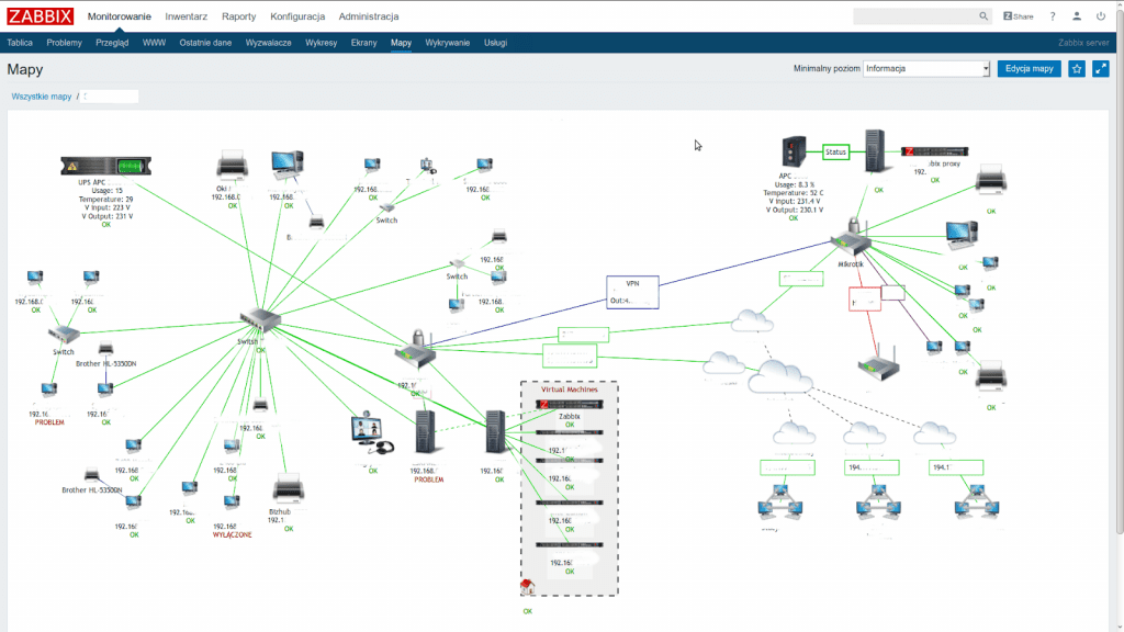 Salah satu fungsi utama Zabbix adalah memonitor jaringan dan infrastruktur secara real-time. Hal ini mencakup server, switch, router, firewall, serta perangkat jaringan lainnya. Dengan fitur ini, tim IT dapat melihat kondisi jaringan secara menyeluruh, termasuk penggunaan bandwidth, trafik, hingga status konektivitas. Kemampuan ini membantu mencegah gangguan sebelum terjadi downtime.